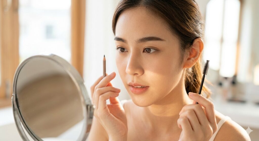 這是很多人會忽略的靈魂工具!修眉前一定要先用螺旋刷,順著毛流生長的方向(眉頭往上、眉尾往下)梳理整齊。這樣你才能清楚看見哪些是真的雜毛,哪些只是因為毛流亂掉而顯得雜亂的眉毛。
